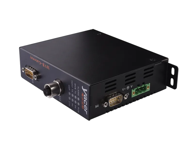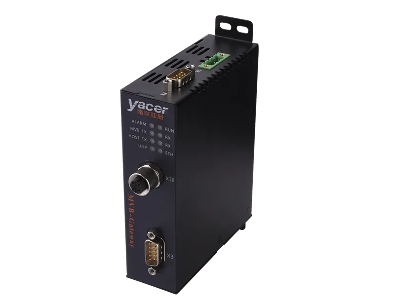 The Yacer MVB-Gateway Multifunction Vehicle Bus Gateway provides 1x MVB bus interface, 1x Ethernet interface, 1x serial port and 1xCAN bus interface, realizes interface conversion between MVB, serial port, CAN port and Ethernet, and supports MVB bus process data ( PD ) acquisition.